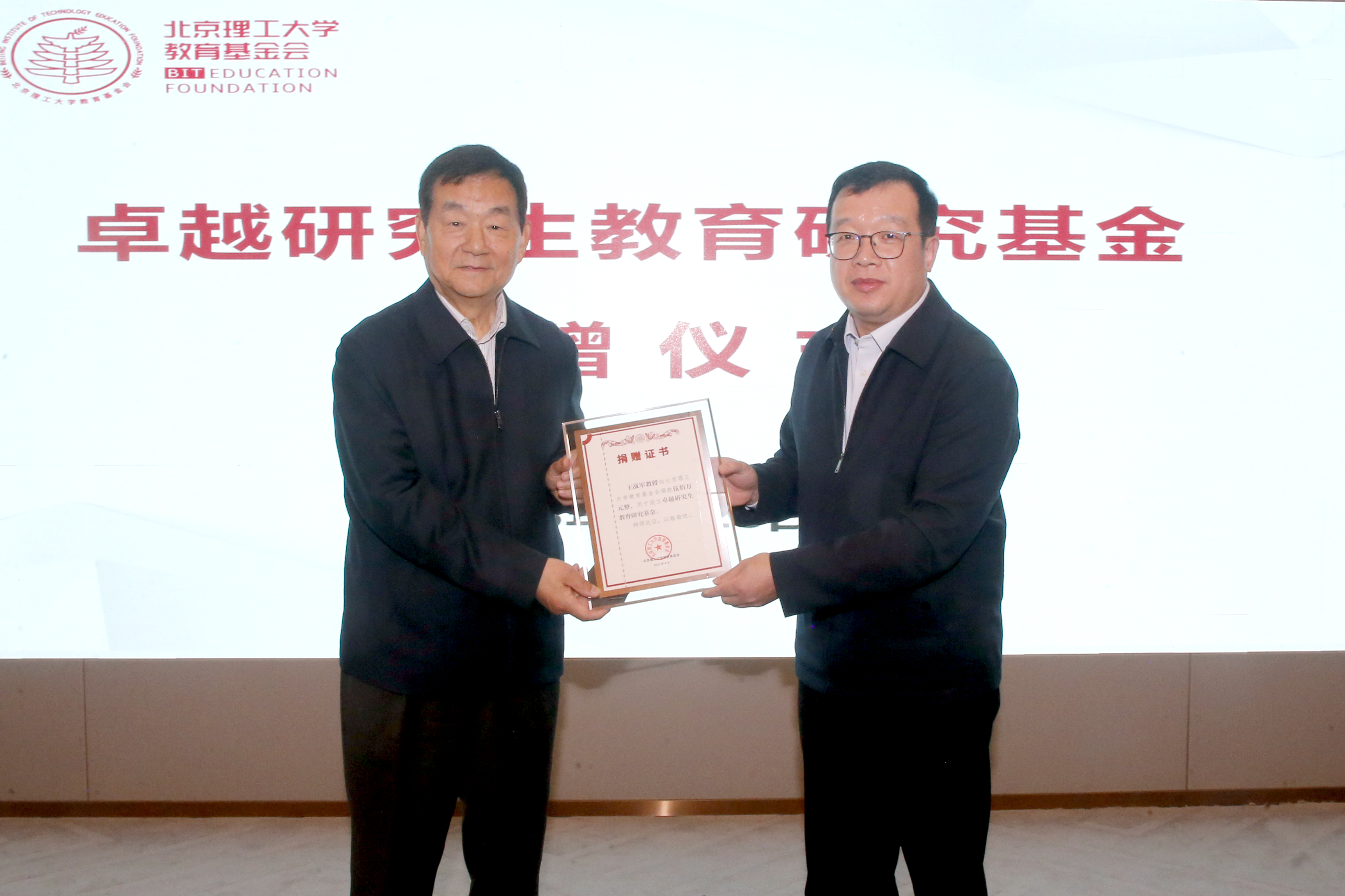 王战军与学校教育基金会签署了捐赠协议,邹美帅向王战军颁发捐赠证书。
