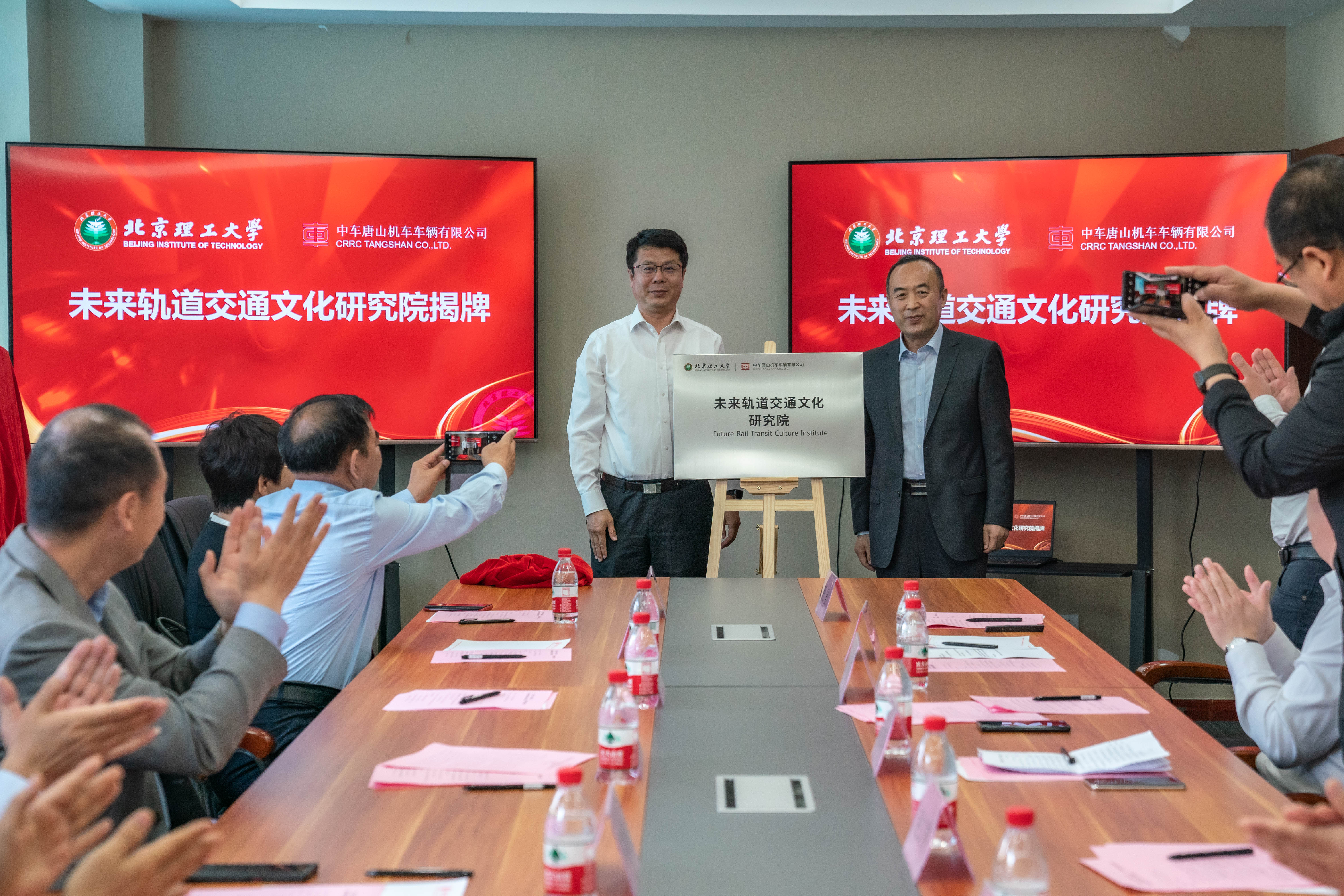 双方代表签署战略合作协议后,秦志辉与吴胜权共同为校企共建的未来轨道交通文化研究院揭牌。